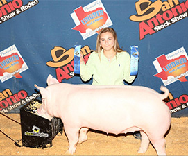 ![]() Class Winning Yorkshire Gilt 2017 San Antonio Stock Show - Jr. Show 3rd Overall 2017 San Antonio Stock Show - Open Show Sired by Trademark Bred by Dr. Mike Tripp |