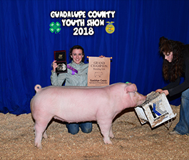 ![]() Grand Champion Breeding Gilt 2018 Guadalupe County Youth Show Shown by Holly Alderson |