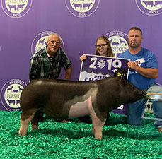 Grand Champion Gilt Overall & Champion Spot 2019 Wabash County Fair, IN Bred & Shown by Brice Patrick Sired by Double Time |