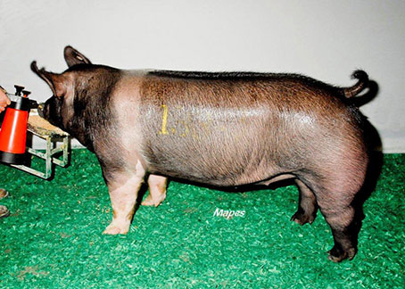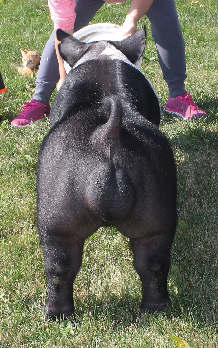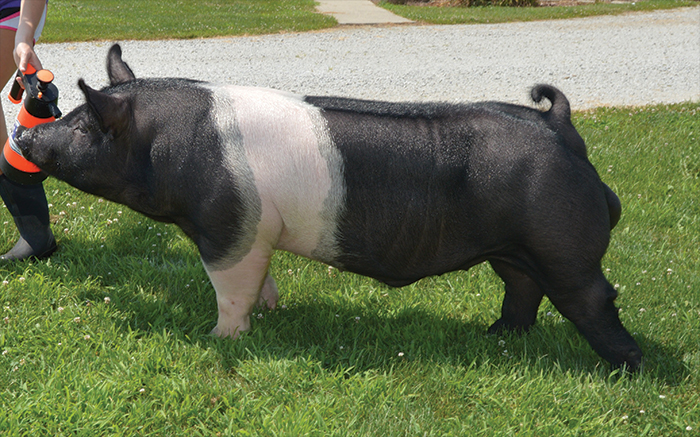 NOTES: You can drive many miles across the country looking but we challenge you to find a trio of young Hampshire boars better than Stop the Madness, Stranded and Bounty Hunter!! Bounty Hunter is one of those boars that gets you excited when you first lay eyes on him. He is one that is complete, problem free and you can’t find any holes in him. When you evaluate him you ask yourself-Is he heavy boned and strong pasterned?-YES. Is he square hipped and really sound and one that can walk all day long?-YES. Does he have a big thick top and great muscle shape?-YES. Is he long fronted with that extra look and style?-YES. Enough center body and width underneath?-YES. Bounty Hunter comes from a proven program with a great sow herd. Bounty Hunter has Trouble Maker on both sides of his pedigree!! We think Bounty Hunter is one that can move the Hampshire breed in the right direction.