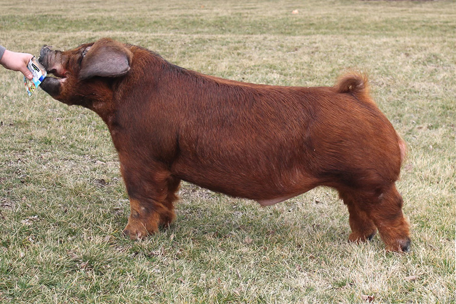 Fireball is the most different Duroc standing here at Top Cut. He definitely has the EST's. Fireball has enormous legs and huge feet. He is more moderate in frame size and length of body and excels in base width and power. He has an enormous back and big massive rib cage. With all this power he still handles it very well with good flexibility. Breed Fireball to those bigger, longer plainer sows that need the extras.